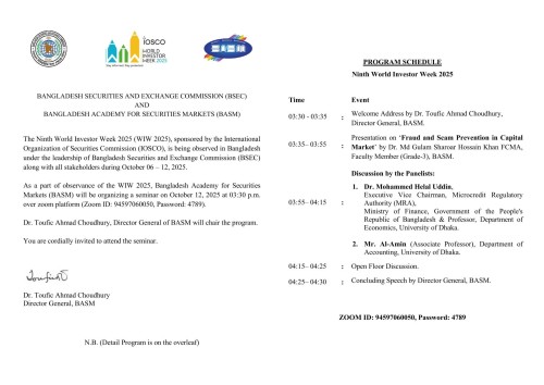 ** As a part of observance of the World Investor Week 2025, BASM will be organizing a seminar on October 12, 2025 at 03:30 p.m. over zoom platform, Zoom ID: 94597060050, Password: 4789 **